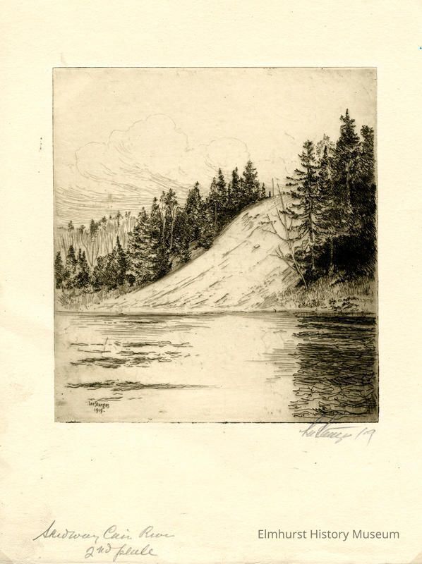 Etching of a skidway into a river. Signed and dated. Second plate.