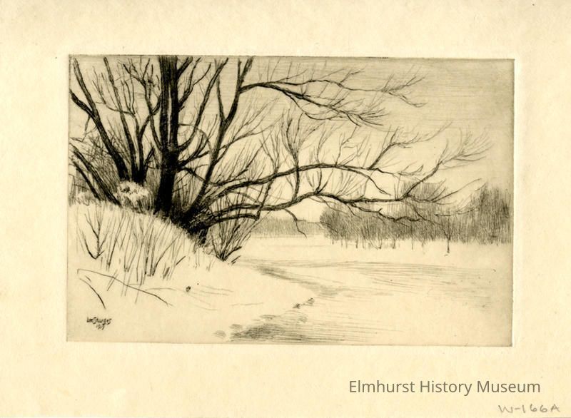 Etching of a frozen river with a snowy landscape. Signed and dated.