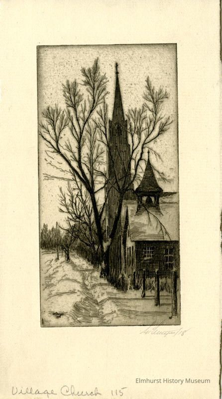 Etching of a chapel on a snowy street. Signed and dated.