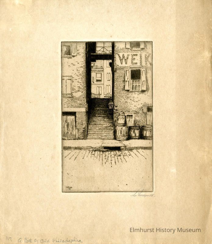 Etching of a street scene looking up a narrow stairway. Signed and dated.