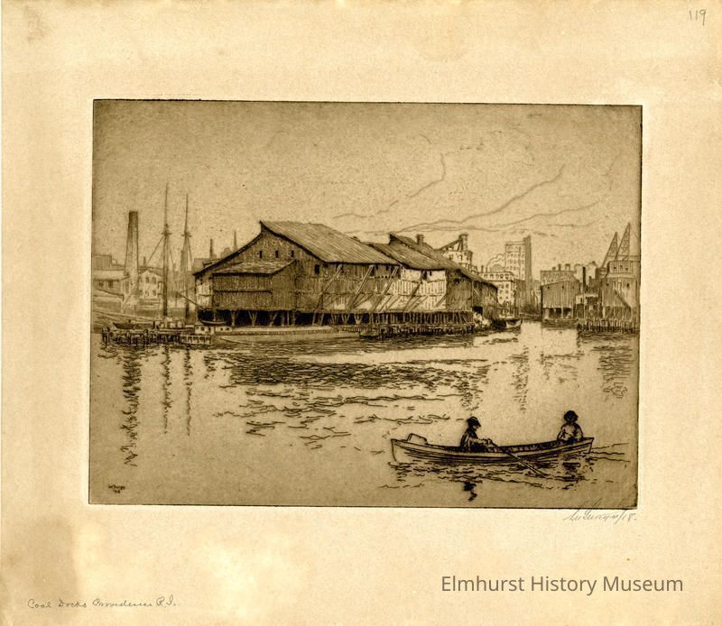 Etching of a couple in a row boat in the bay at Providence, RI. Water in forefront with a city skyline on the shore. Signed and dated.