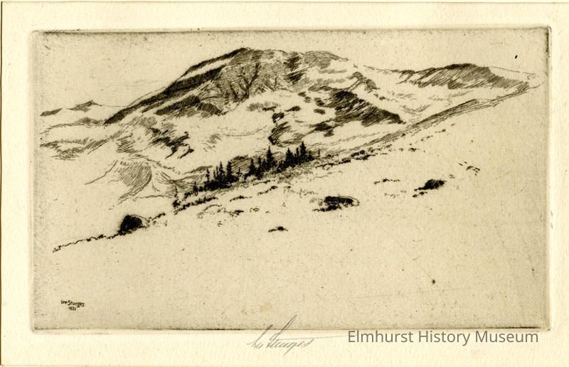 Etching of a glacier. Signed and dated. The etching is mounted on a 2-page mat.