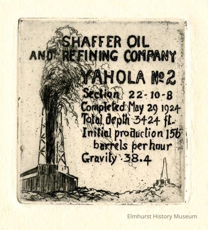 Etching of a "gusher" (overflowing oil strike) with text: "SHAFFER OIL/ AND REFINING COMPANY/ YAHOLA NO. 2/ Section 22-10-8/ Completed May 29 1924/ Total depth 3424 ft./ Initial production 156/ barrels per hour/ Gravity 38.4"