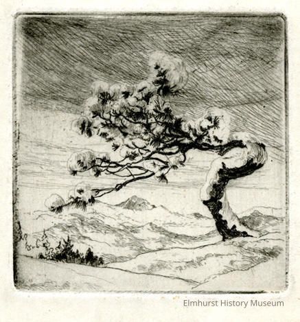 Etching of a snow-covered tree. Initialed in lower left corner of etching.