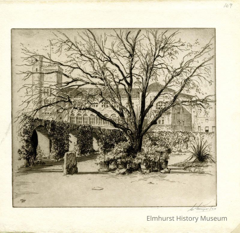 Etching of a walled garden in front of a large building. Signed and dated.