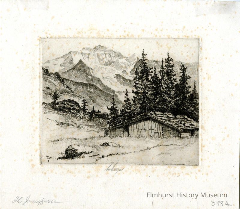 Etching of a cabin in the foreground and mountains in the background. Signed and dated.