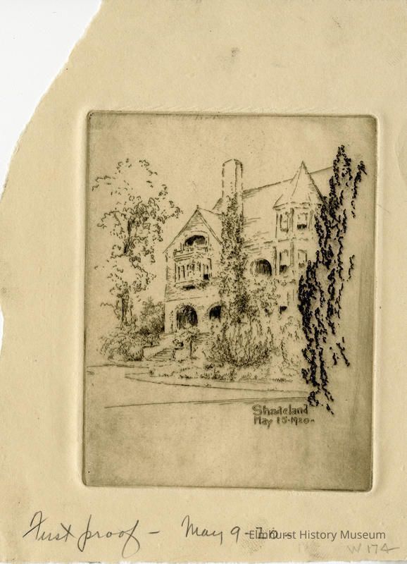 Etching of Shadeland, Lee Sturges' mansion in Elmhurst. First proof.