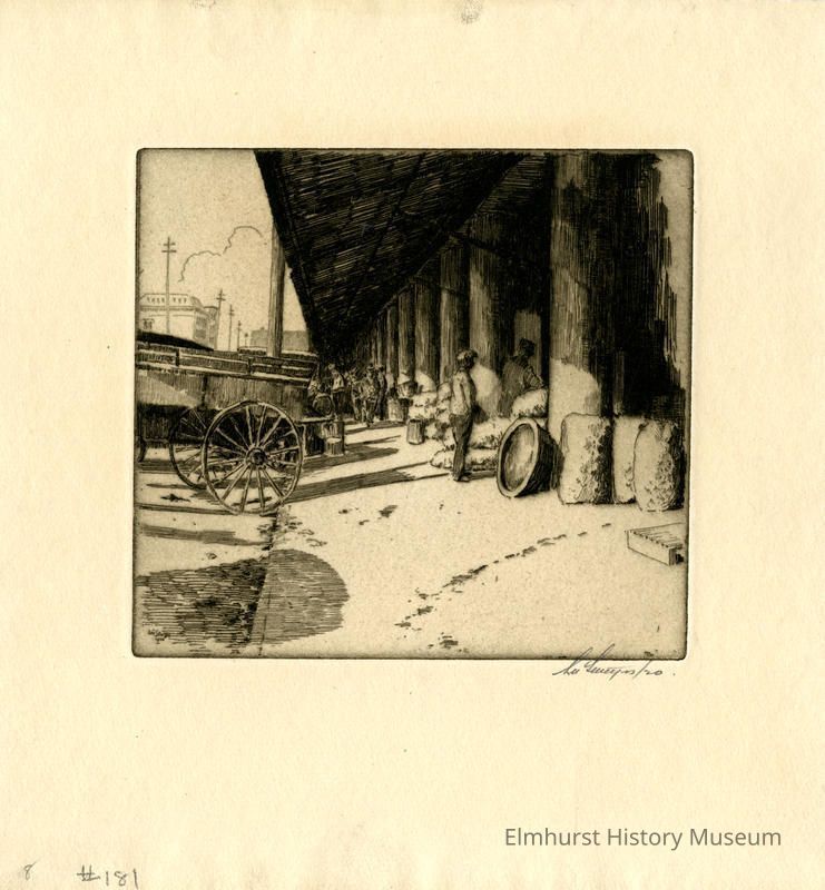 Etching of wagons pulled up to a sidewalk with large sacks piled on the sidewalk. Signed and dated.