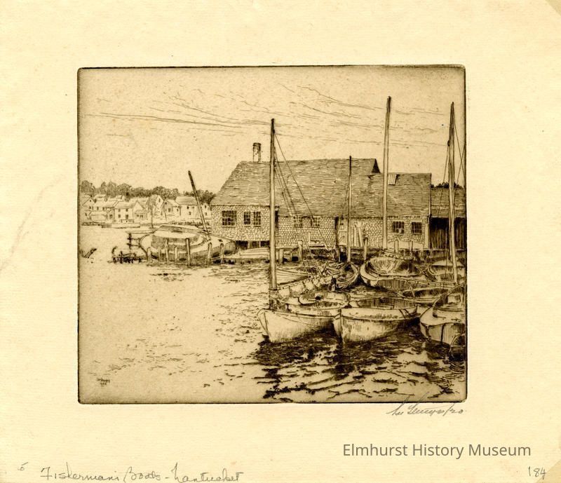 Etching of boats tied up to a dock in a bay. Buildings in background. Signed and dated.