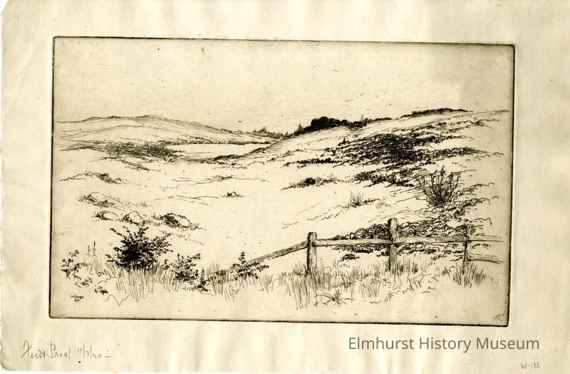 Etching of a field with rolling hills in the background. Signed and dated. First proof.