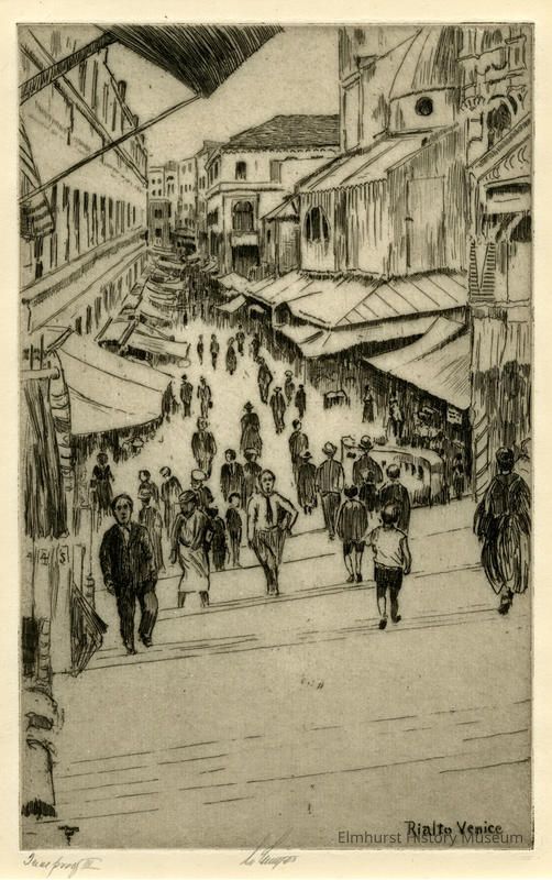 Etching of a busy street scene. Trial proof. Signed and dated.