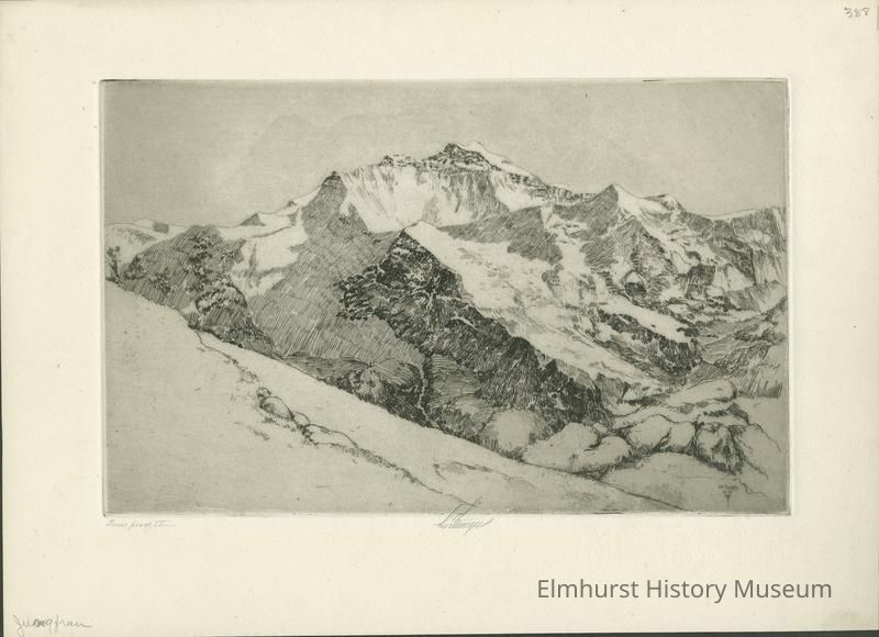 Etching of a snowy mountain scene. Trial proof. Signed and dated.