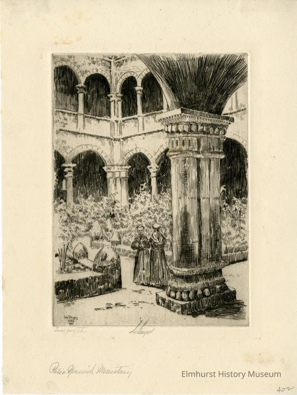 Etching of two friars in interior courtyard of a monastery. Trial proof.