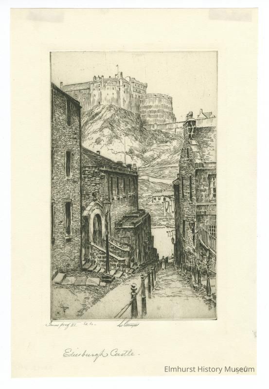 Etching of a narrow street scene with a castle in the background. Trial proof. Signed and dated. Accompanying the etching is a label from the Hoosier Salon Exhibition Jan.30 - Feb. 13, 1937.