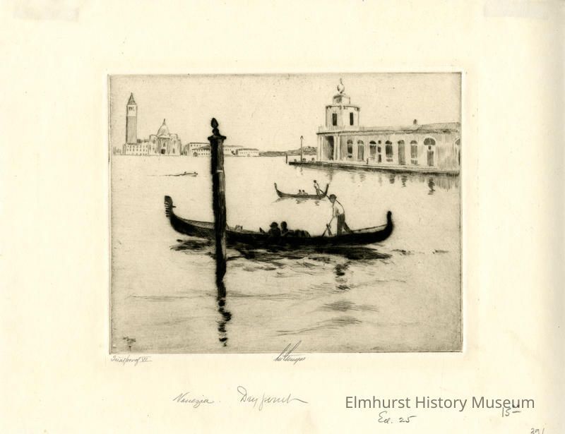 Etching of canals in Venice, Italy. Trial proof. Signed and dated.
