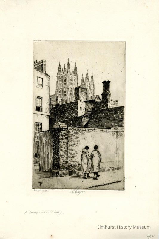 Etching of a couple walking down a street with towers of cathedral in the background. Trial proof. Signed and dated.