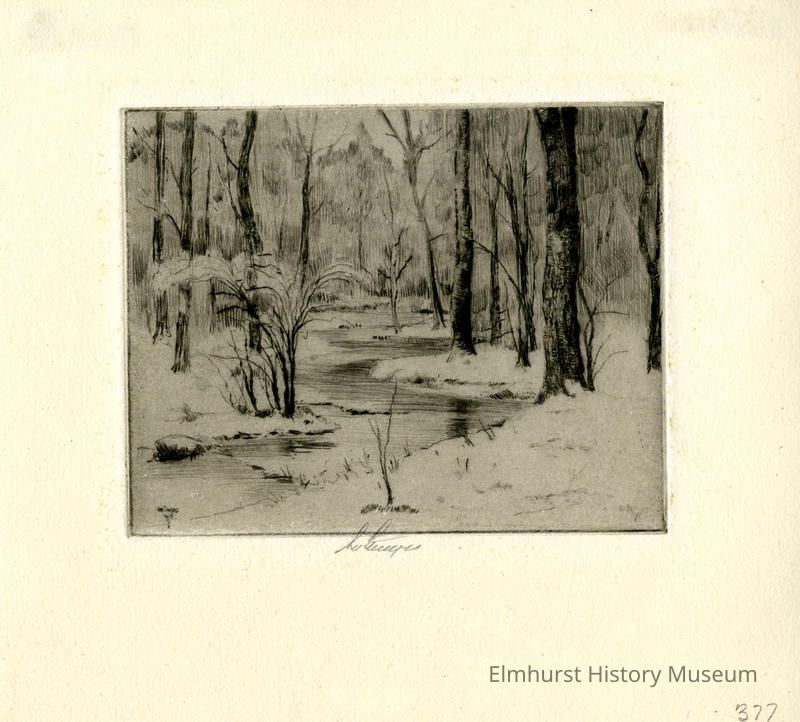 Etching of a creek in winter. Signed and dated. Also described as snowy woods with stream. Accompanying the etching is a tag from the Hoosier Salon Exhibition Jan 25 - Feb 8, 1936.