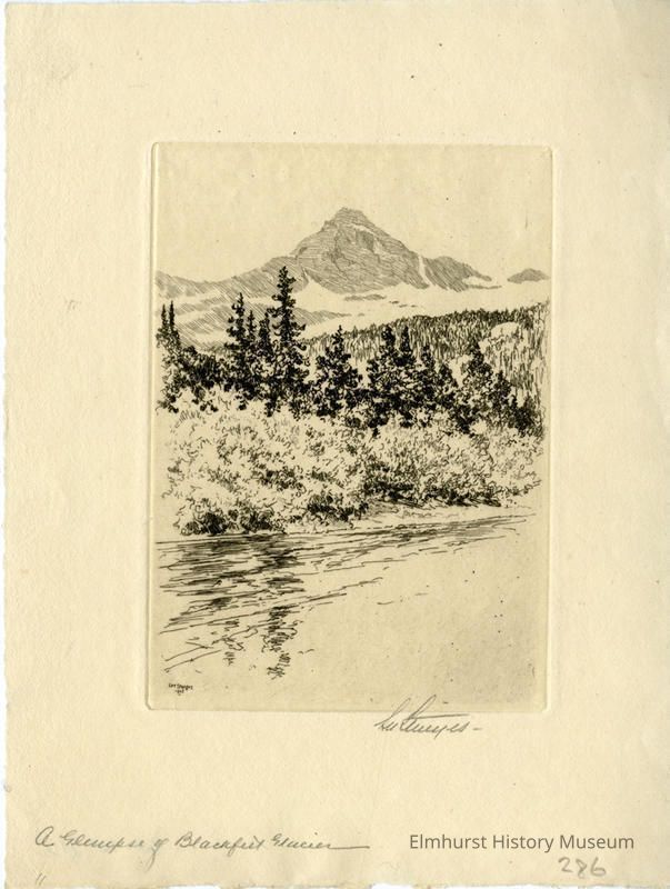 Etching: a lake in the foreground with trees in the midground and a mountain (with glacier) in background. Signed and dated. A Christmas card.