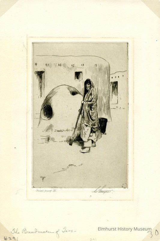 Etching of a Native American Indian woman in front of an outdoor oven. Signed and dated.