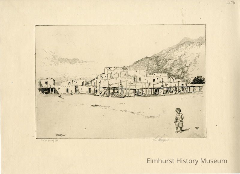 Etching of an adobe village with a child in the right foreground. Signed and dated.