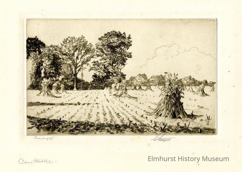 Etching of a corn field that has been harvested with stacks (shocks) of cornstalks scattered through the field. Signed and dated.
