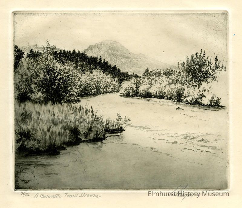 Etching of a river with bushes on each shore and a mountain in the background. Signed and dated.