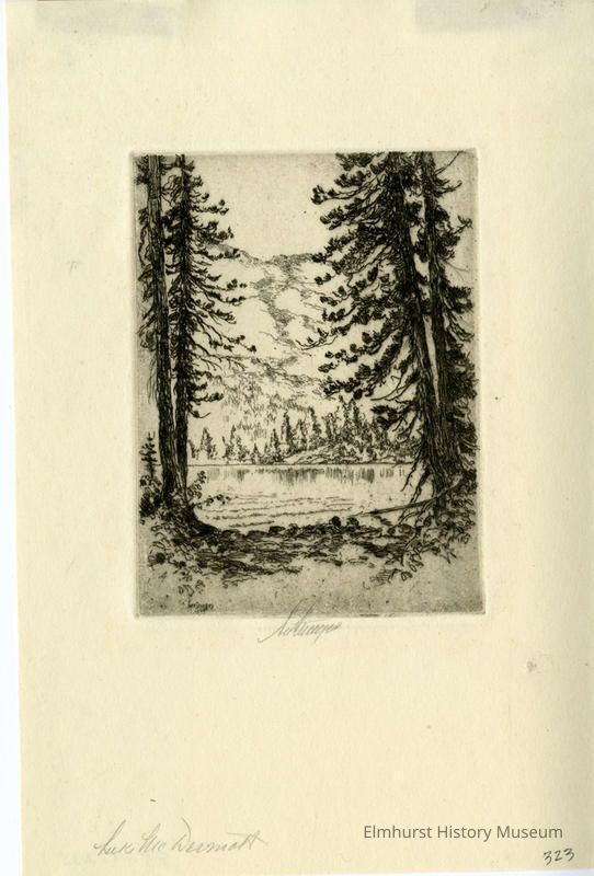 Etching of a lake scene framed by trees. Signed and dated.