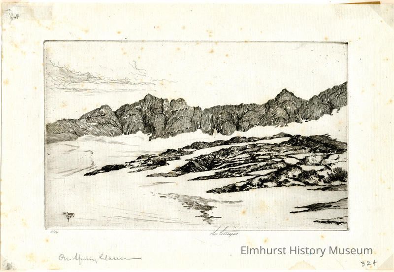 Etching of glacier and rock. Signed and dated.