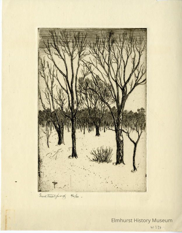 Etching of bare orchard trees and snow on the ground. First trial proof. Signed and dated.