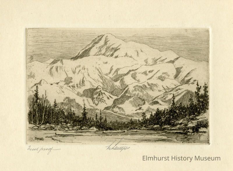 Etching of a snow covered mountain (background) with trees and a clearing (foreground). Signed and dated. First proof.
