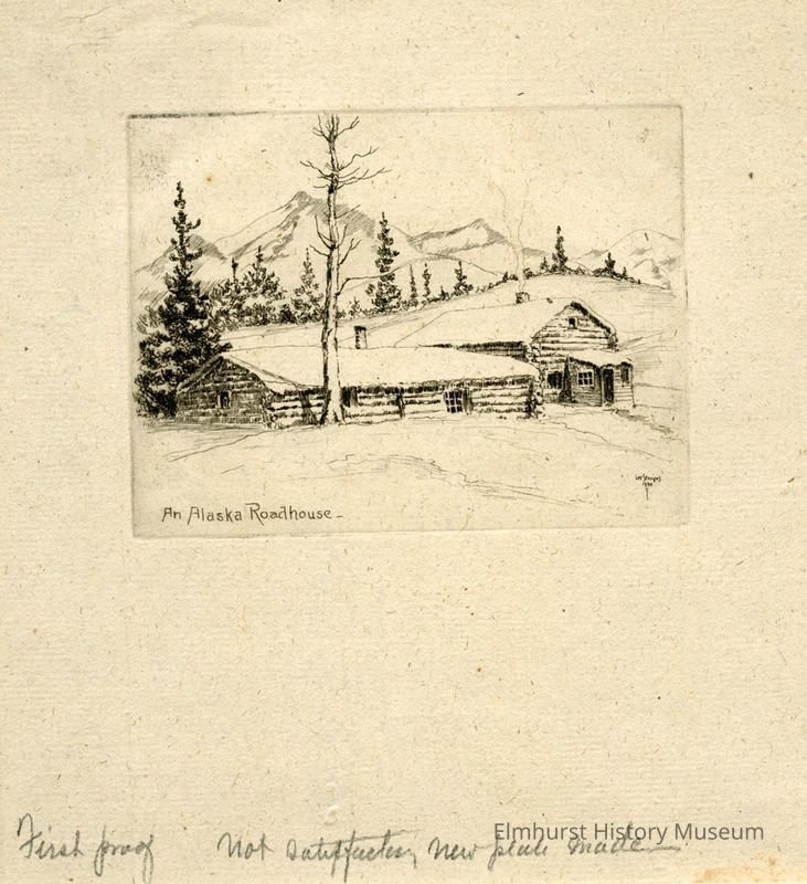 Etching of log buildings against a mountain background. First proof. Signed and dated.