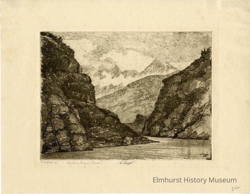 Etching of a river canyon winding through mountains. Signed and dated. Trial proof.
