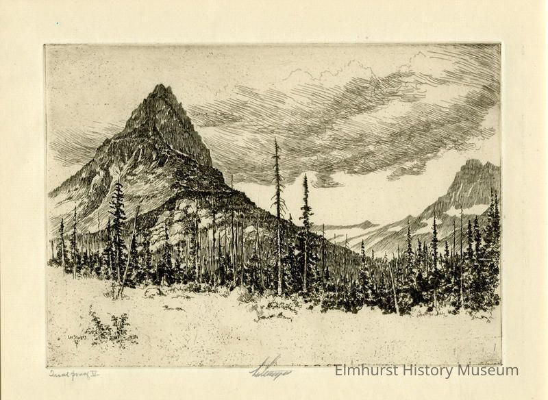 Etching of storm clouds over a mountain peak. Trial proof. Signed and dated.