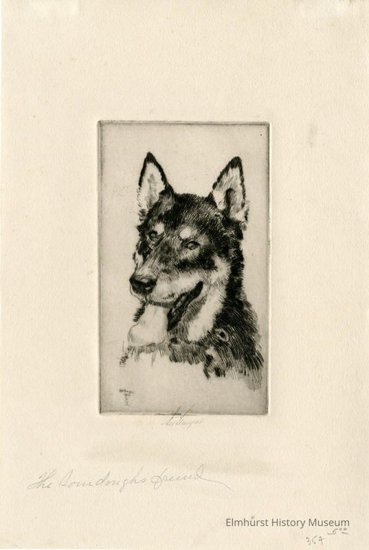 Etching of a dog's head. Signed and dated.