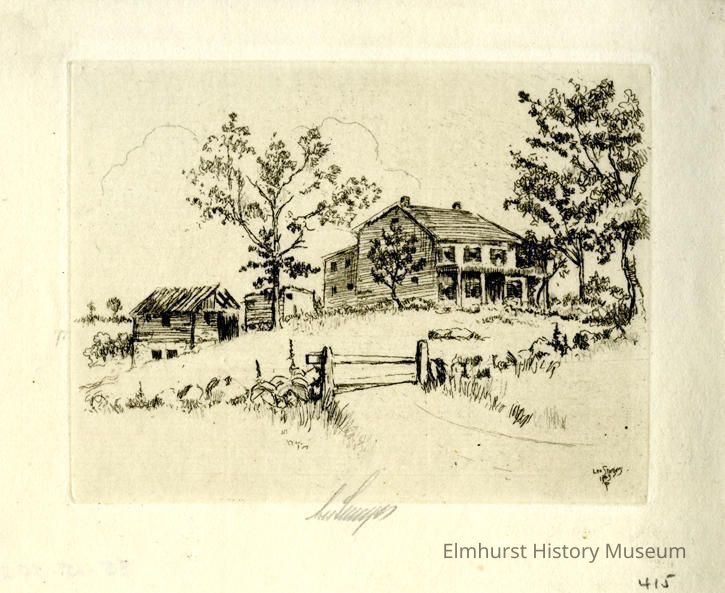 Etching of a farmstead: a house and outbuildings on a hill (#415 Deserted Farmhouse on Sturges master list). Signed and dated.