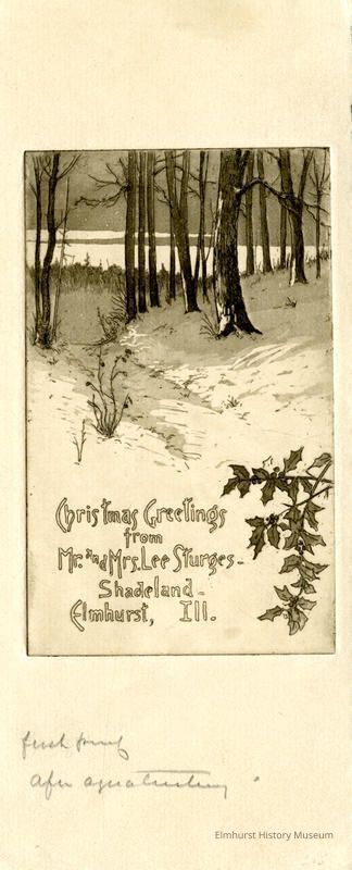 Etching: snowy forest scene with text, "Christmas Greeting / from / Mr. and Mrs. Lee Sturges -/ Shadeland -/ Elmhurst, Ill." First proof after aquatinting.