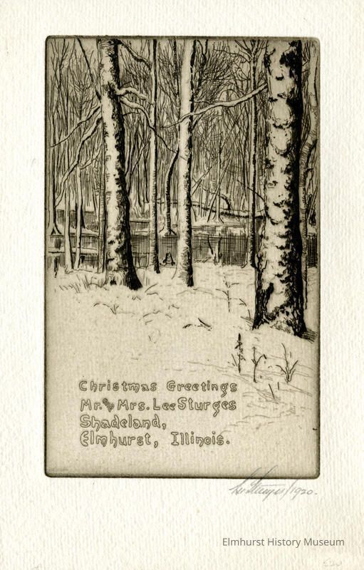 Etching of a snowy forest above text, "Christmas Greetings / Mr. and Mrs. Lee Sturges / Shadeland, / Elmhurst, Illinois." Signed and dated.