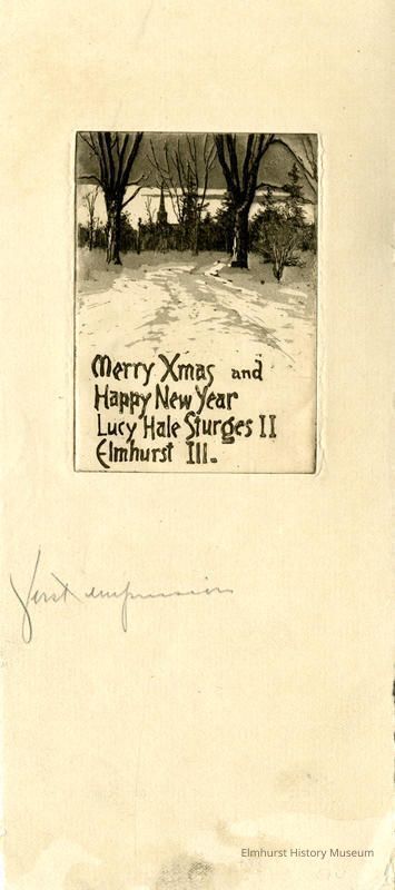 Etching: a snow scene with trees and a church steeple in the background above the text: "Christmas Greetings Merry Xmas and /Happy New Year / Lucy Hale Sturges II / Elmhurst Ill. Not dated. First impression.