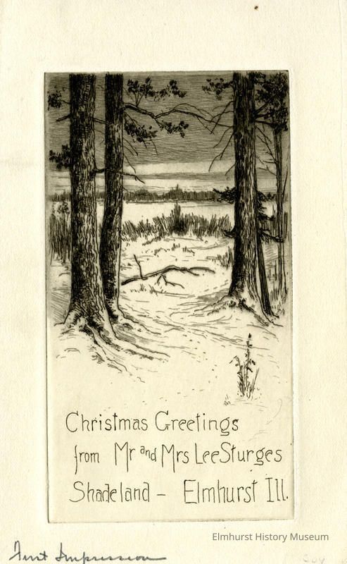 Etching: a snow scene above the text: "Christmas Greetings / from Mr and Mrs Lee Sturges / Shadeland - Elmhurst Ill." Not dated. First impression.