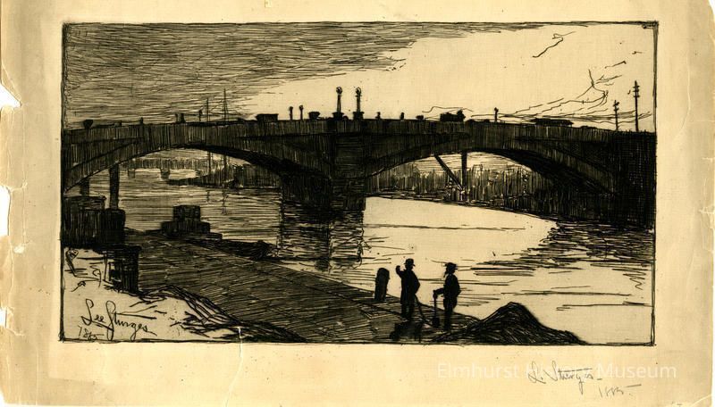 Etching of a large bridge spanning a river (the Schuylkill River?). Signed and dated.