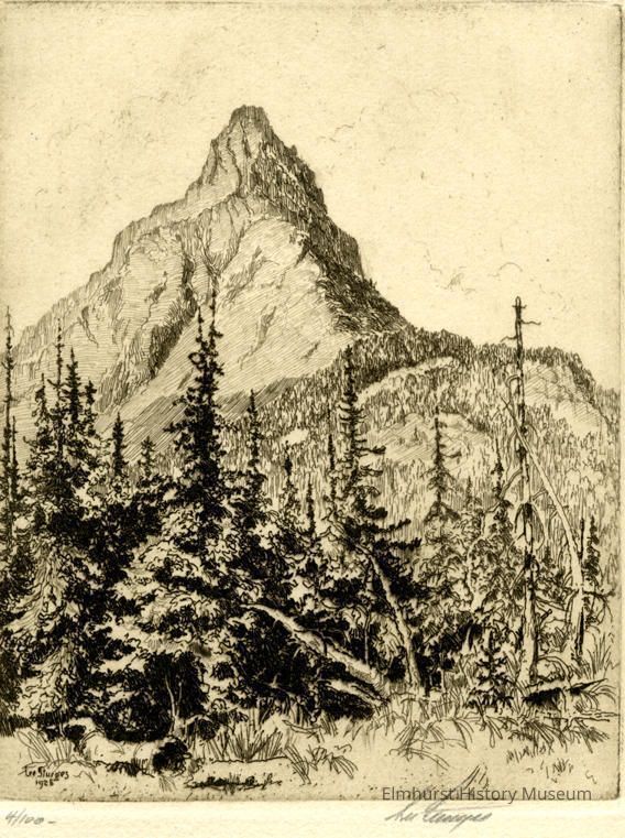 Etching of a mountain. Mounted on a 2-page mat. #4/100. Signed and dated.