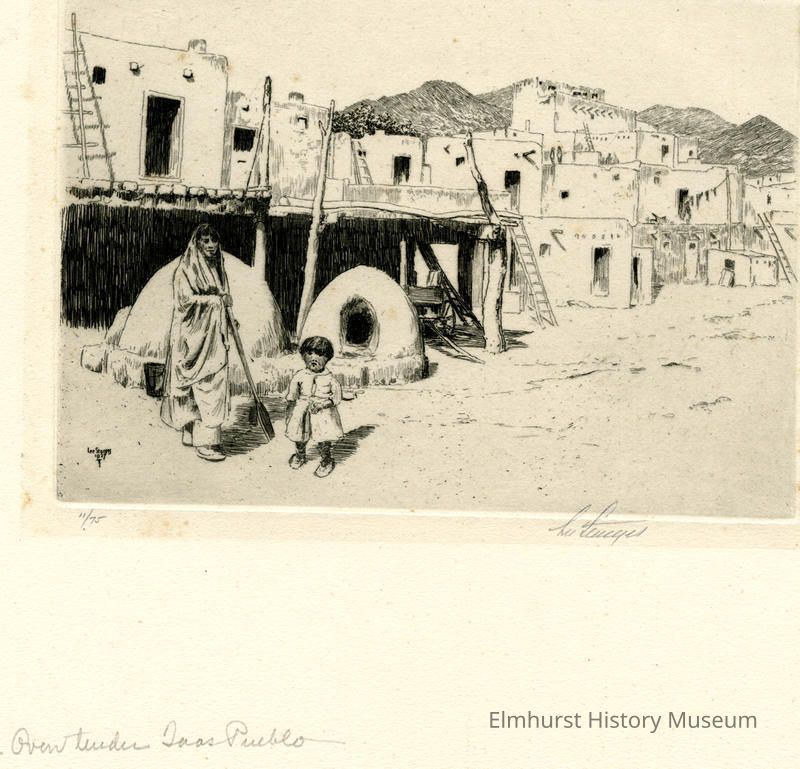 Etching of a Native American Indian child and woman tending an outdoor oven. Mounted on a 2-page mat. #11/75. Signed and dated.