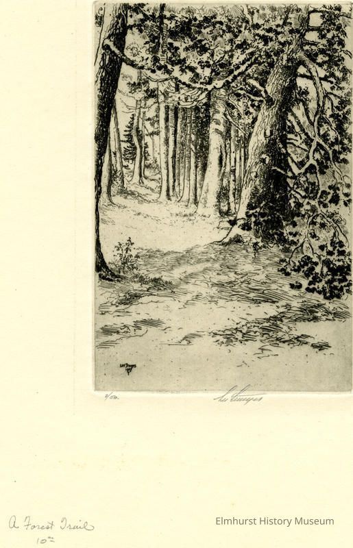 Etching of a clearing in a woods. Mounted on a 2-page mat. #8/50. Signed and dated.