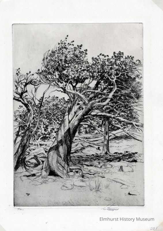 Etching of a large gnarled tree. Mounted on a 2-page mat. #8/50. Signed and dated.