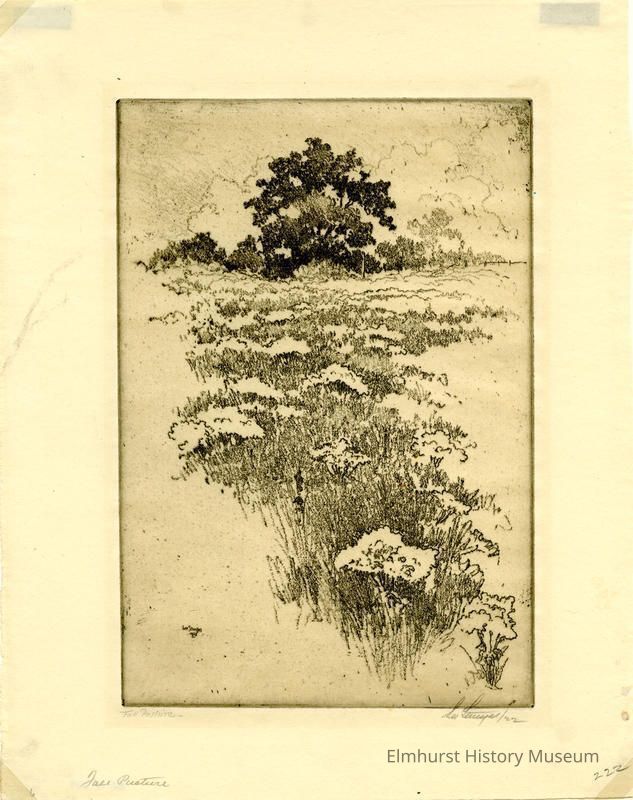Etching of a meadow. Mounted in a 2-page mat. Signed and dated.
