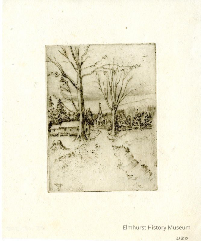 Etching of a church at the end of a snowy path. Signed and dated.