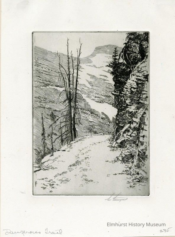 Etching of a snowy mountain pass. Mounted on a 2-page mat. Signed and dated.