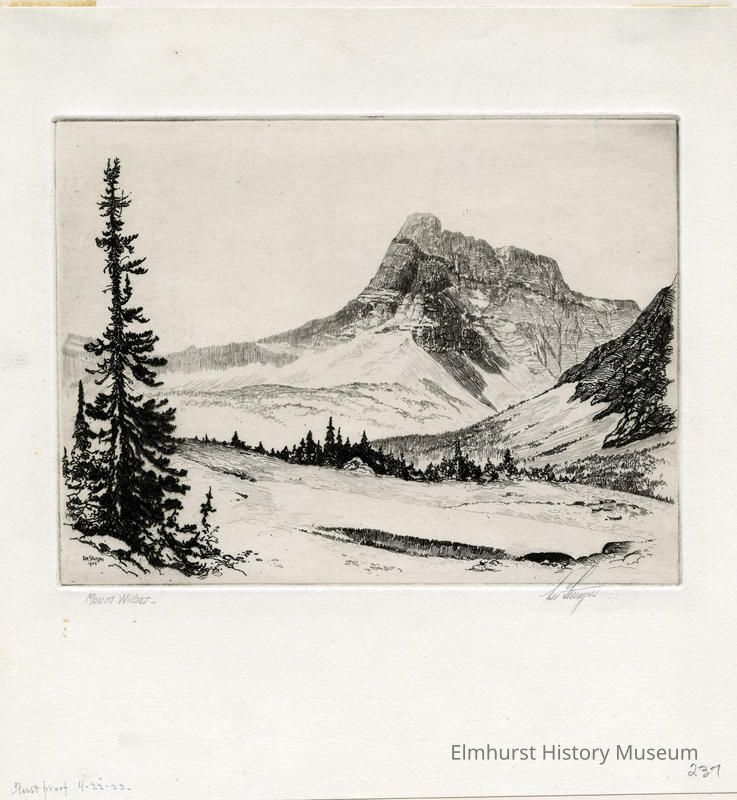 Etching: a mountain, Mt. Wilber, in the background. Mounted on a 2-page mat. Signed and dated. First proof.