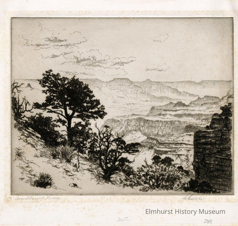 Etching of the Grand Canyon. Mounted on a 2-page mat. Signed and dated.