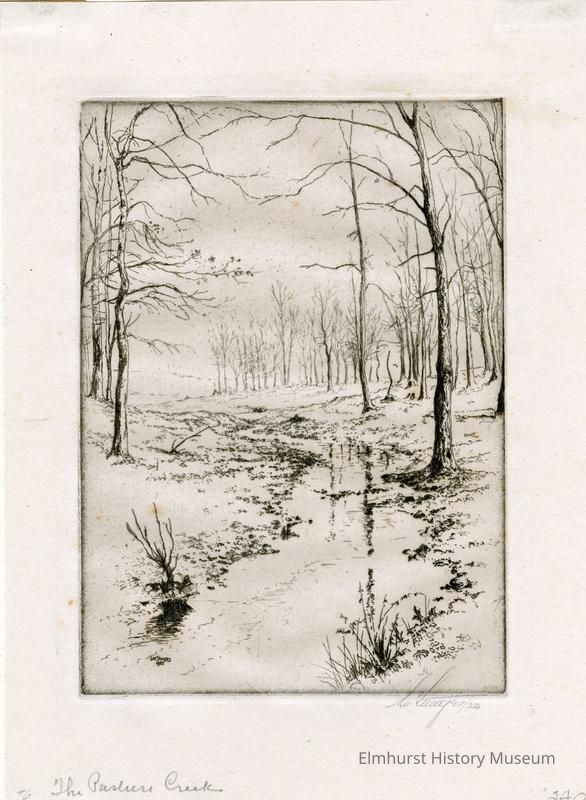 Etching of a creek in winter. Mounted on a 2-page mat. Signed and dated.